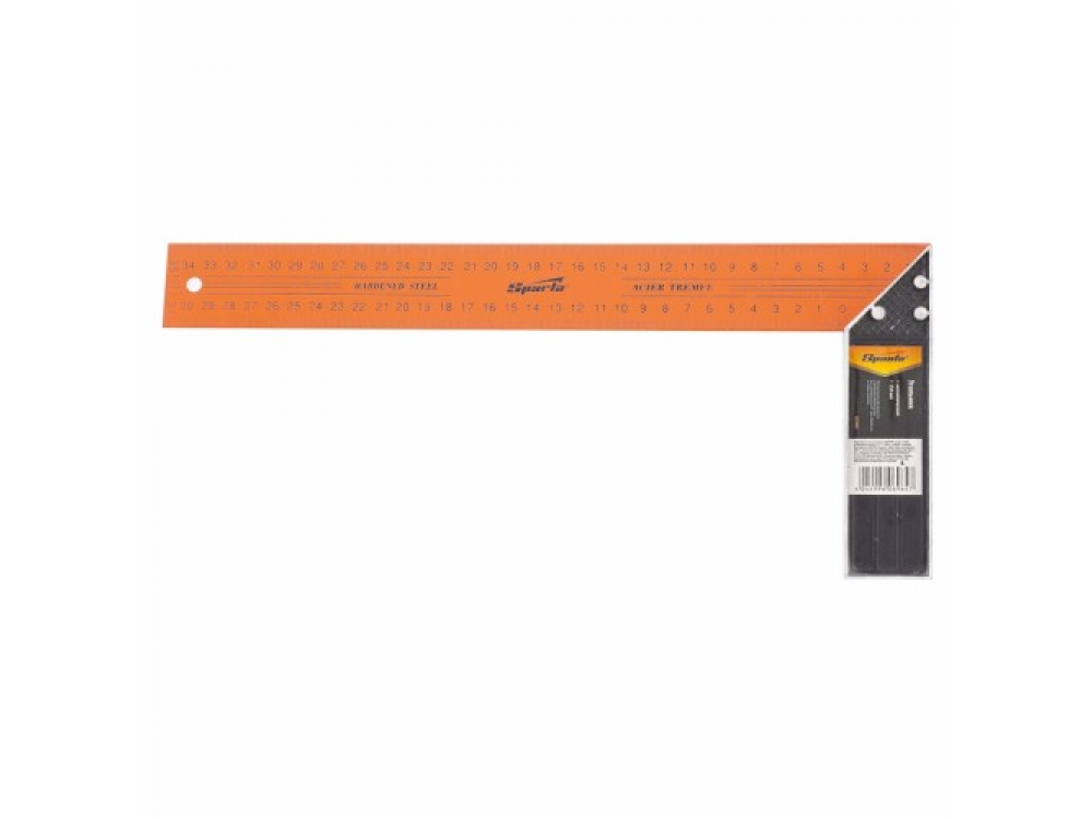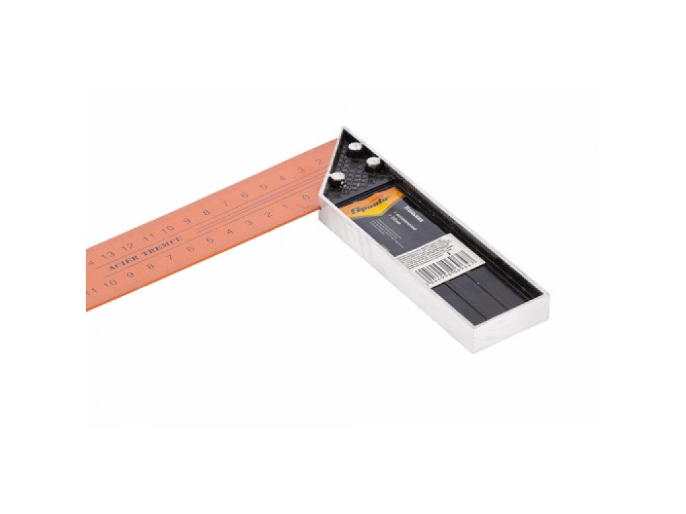 Металлический угольник с окрашенной поверхностью и двухсторонней разметкой полотна. Полотно угольника имеет двухстороннюю разметку. Предназначен для разметки и проверки прямых углов, а также для проверки угла 45 градусов при обработке и сборке изделий.