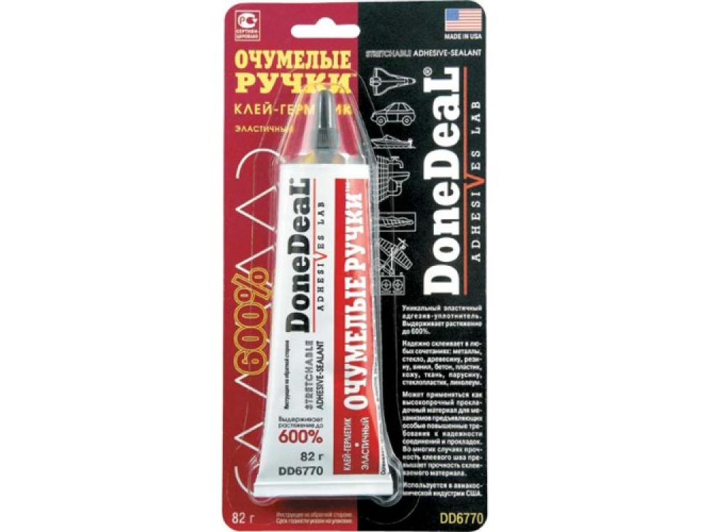 Уникальный водостойкий полиуротановый клей герметик DD6770 формирует суперэластичнный (выдерживающий 600% растяжение) уплотняющий слой с высокой адгезией к большинстшу полиморных материалов: поливинилхлориду (ПВХ, винилу, линолеуму), полиуретану, полиметилметакрилату (оргстеклу) и другим, также пригодон для герметизации и склеивания резиновых, тканых (включая парусину), керамических, кожаных, шероховатых металлических, деревянных и других поверхностей. Обладает хорошей термостойкостью сохраняет эксплуатационные свойства при температурах до 105"С. Уплотняет и герметизирует торцевые соединения отделочных пластиковых панелей, линолеума и кафельных плиток. Пригоден для последующей окраски. Герметизирует соединения водопроводных и канализационных систем, вентили и т. д. Пригоден для ремонт обуви. Эластичность клея-герметика позволяет использовать его для работы с материалами, испытывающими деформационные нагрузки. Имеет сотни применений в хозяйстве, автомобиле и хобби. Прочность слоя герметика при растяжении достигает 390 кг/см. Является незаменимым средством для ремонта автомобиля, дома, квартиры, дачи, служебного помещения, бытовой и водомоторной техники, обуви и спортивного инвентаря, систем водоснабжения и канализации, домашней утвари и т. п.