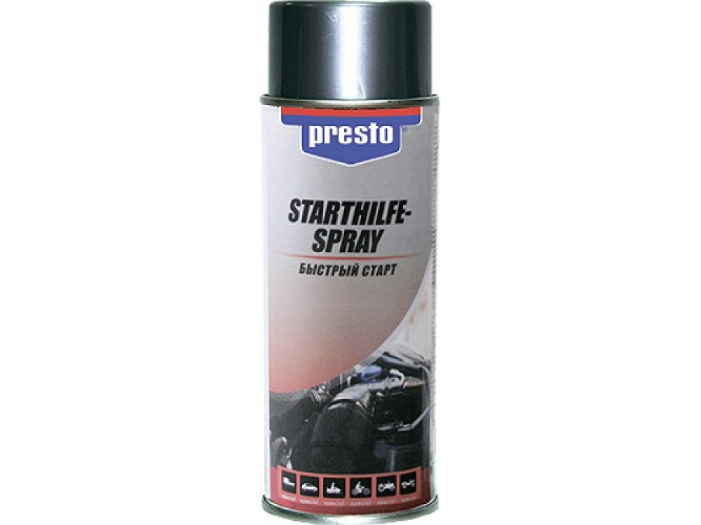Спрей PRESTO Быстрый старт &ndash быстродействующее средство на основе эфира, которое используется при возникновении проблем с запуском бензиновых и дизельных двигателей. Легковоспламеняющийся состав обеспечивает быстрый и в то же время мягкий старт. Просто распылите продукт в воздухозаборник двигателя.