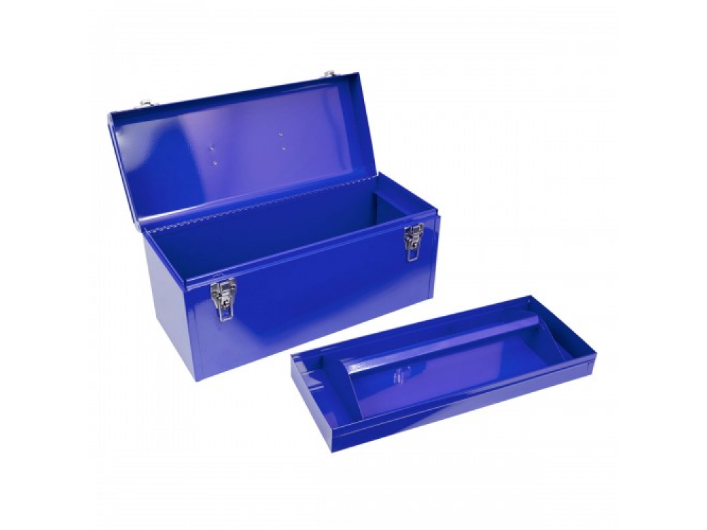 Ящик инструментальный, синий 512-01510B служит для организации рабочего места в любом производственном помещении, на станциях технического обслуживания или авторемонтных мастерских, хранение инструмента, мобильность. Технические характеристики: - Тип ящика: переносной с крышкой - Дополнительный выносной лоток: есть - Замок: 2 шт., металлический, тип фиксатора CLIP-LOCK - Материал: сталь - Покрытие: порошковая окраска - Цвет: синий - Габариты: 510 х 218 х 240 мм - Вес: 5 кг