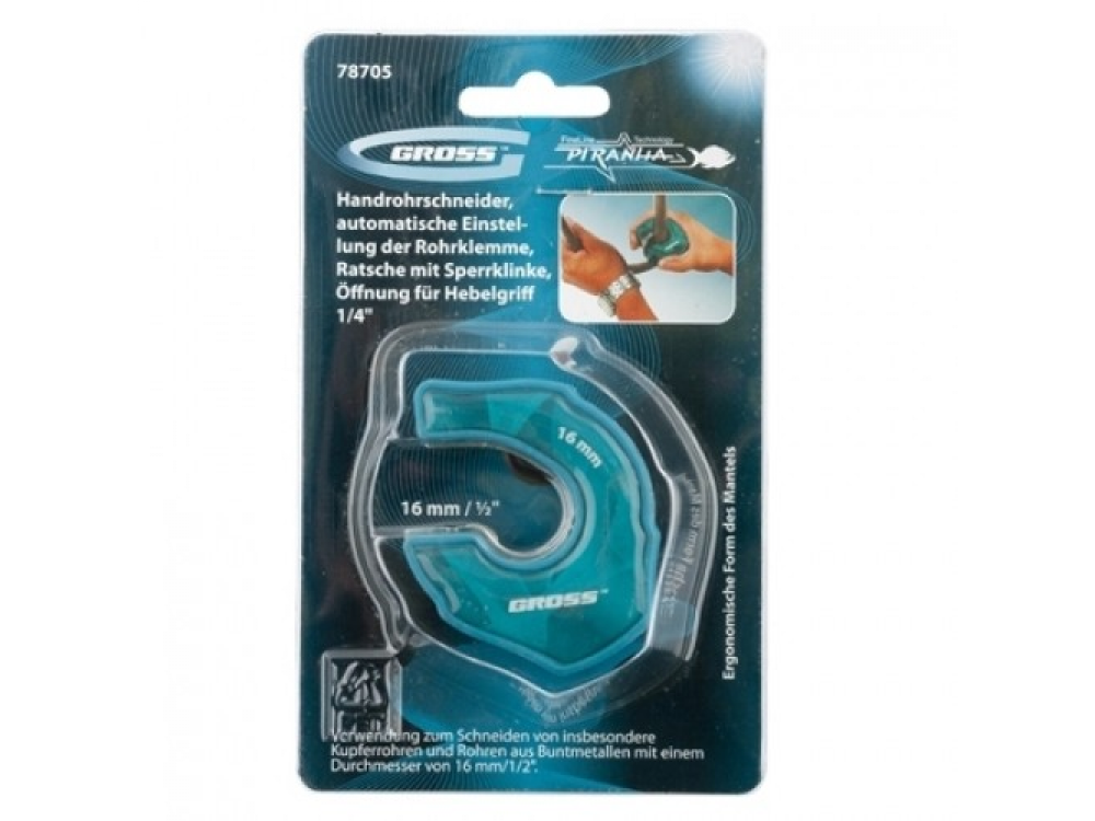 Труборез ладонный PIRANHA торговой марки GROSS предназначен для резки труб из цветных металлов диаметром до 16 мм. Автоматическая регулировка зажима трубы и наличие храпового механизма обеспечивает высокую производительность труда при работе с инструментом. Режущий элемент выполнен из японской стали SUJ2, твердость которой составляет 56-58 HRC. Эргономичный корпус трубореза выполнен из ударопрочного пластика. Технологическое отверстие в корпусе размером 6,4 х 6,4 х 6,5 мм предназначено для использования воротка-удлинителя в труднодоступных местах. Особая конструкция предусматривает быструю замену режущего элемента ролика.